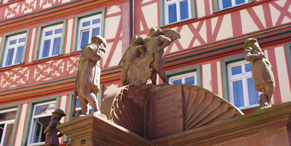 © Jürgen Gerhardt, xxdesignpartner.de Befestigungsschienen für Hochwasserschutz und eine Hochwassermarke in der Wertheimer Altstadt